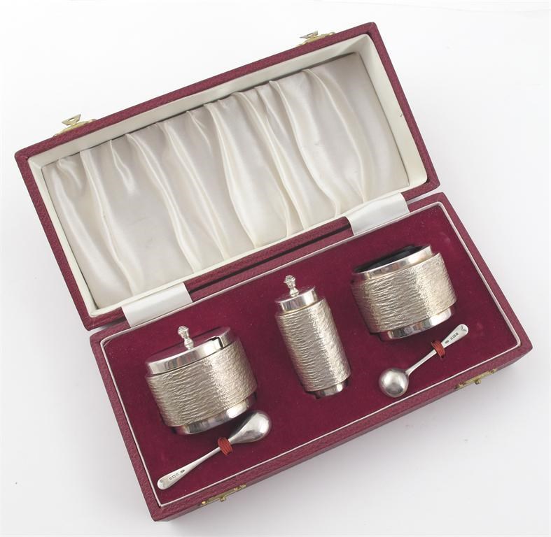 A Deakin & Francis silver cruet set, textured finish, comprising; salt with glass liner, pepper pot, mustard pot and cover with glass liner, two serving spoons, in fitted case stamped marks, Birmingham 1973 pepper 6.5cm. high