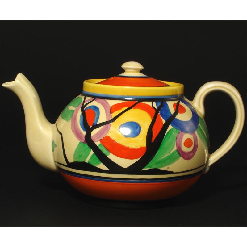 'Circle Tree' a Fantasque Bizarre Globe teapot and cover painted in colours, professional restoration to tip of spout 11.5cm. high