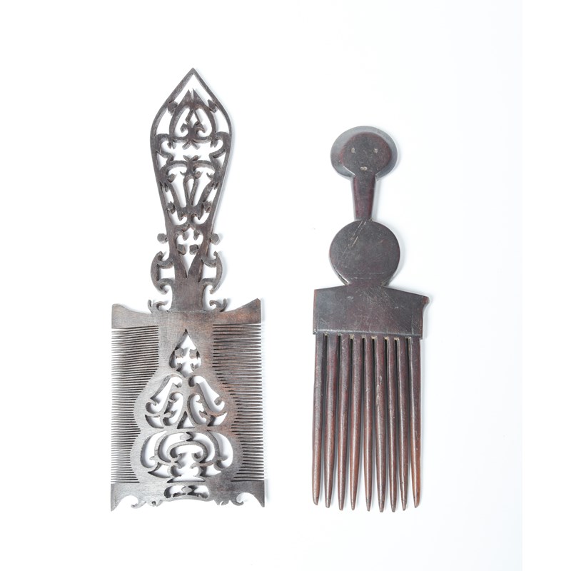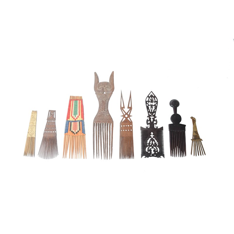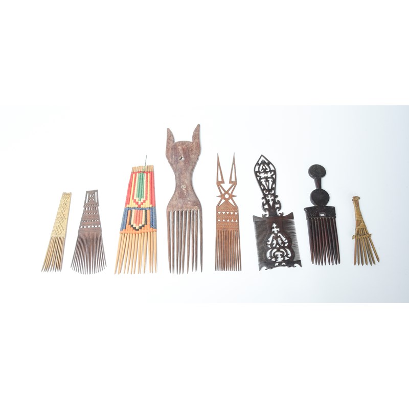 including Ashanti with a head handle and incised linear decoration, 21.5cm long, Massim, 33.8cm long, two Samoa, 18.1cm and 25.9cm, Indonesia, 25cm long, two Oceanic with woven fibre, 14.5cm and 17.5cm long, and one with woven cotton and brass wire, 23.4cm long. (8)