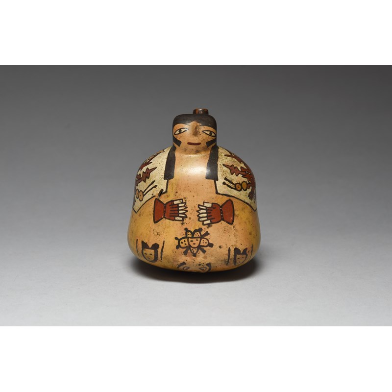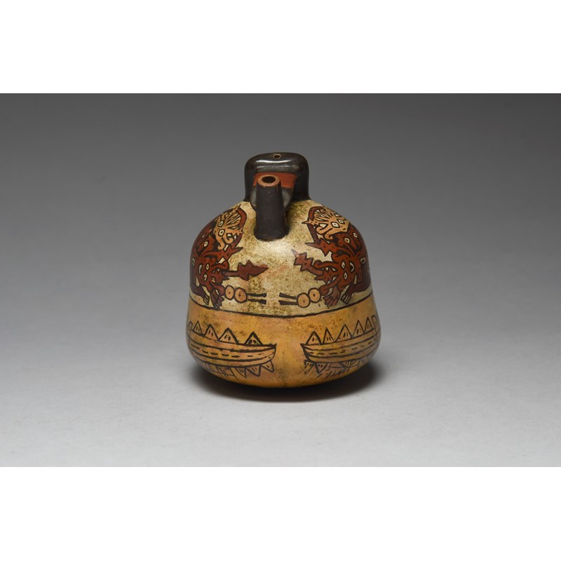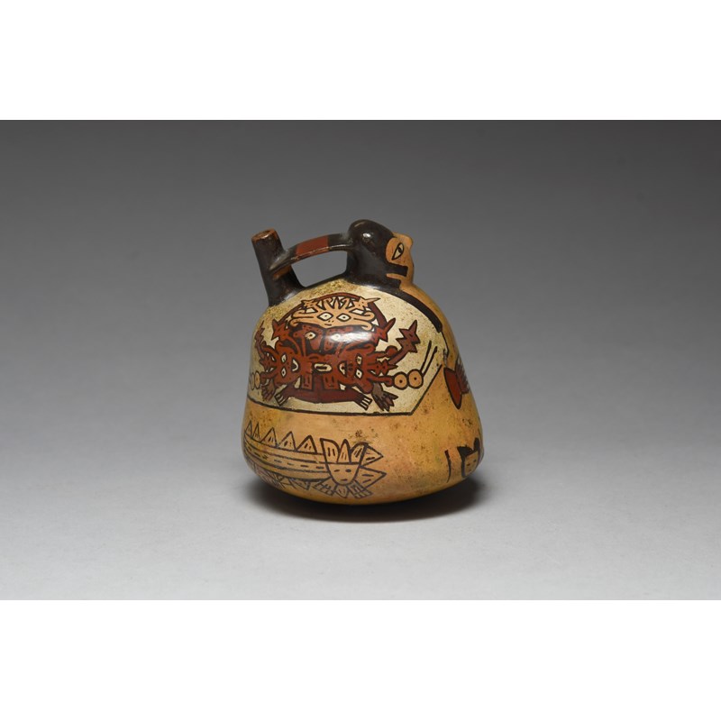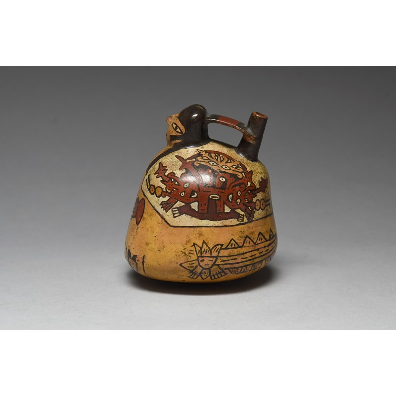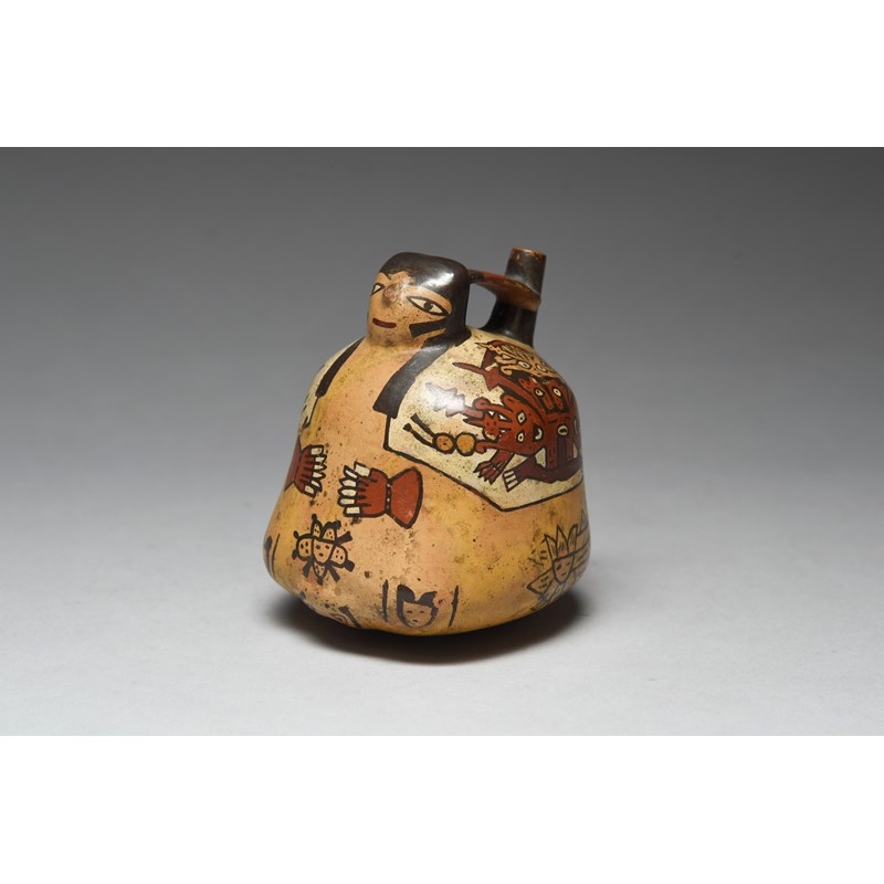 pottery, with a spout linked to a woman's head, with painted decoration including a pair of six fingered hands, two panels with a masked figure with multiple heads, the lower section with further heads and flying beasts,