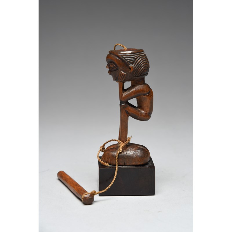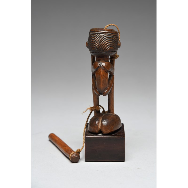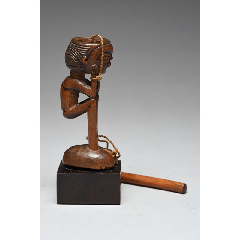 the squatting figure with a recessed head and with a lid, having a linear carved coiffure and almond shaped eyes and pouting lips, with his hands supporting his head and with his elbows on his knees, to a large pair of feet, with a pestle,