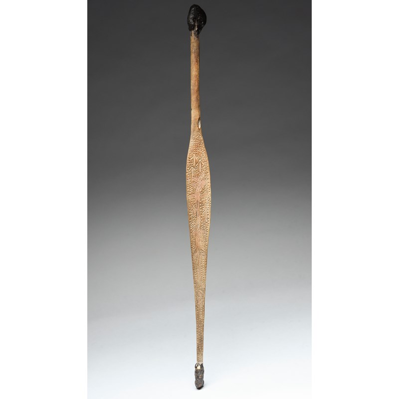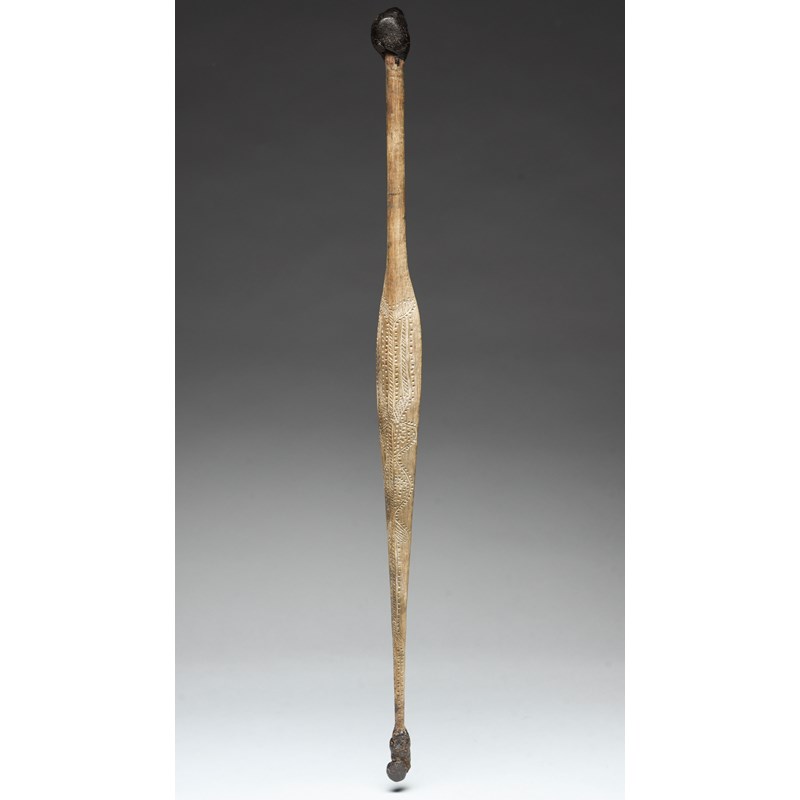 with stylised carving to both sides, the front with emu tracks and red pigment, the ends with gum, one with remains of the bone spike, 19th century,