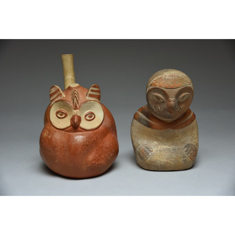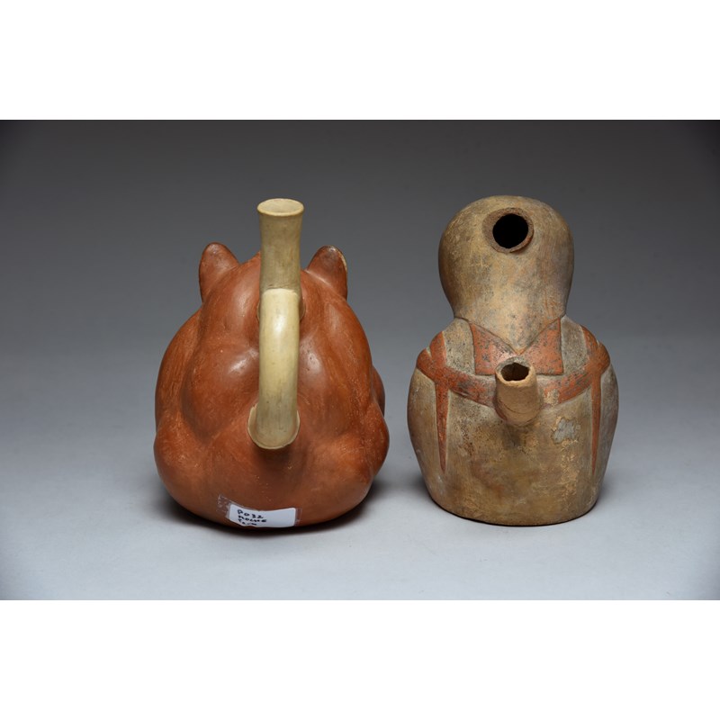and a Moche owl stirrup spout vessel, 20.5cm high.. (2)