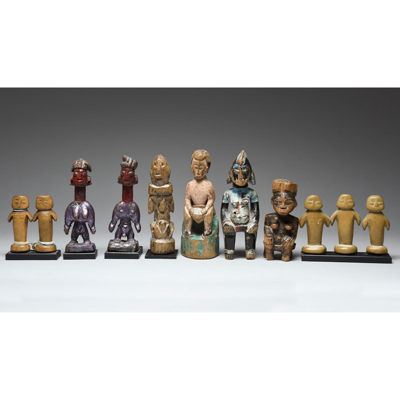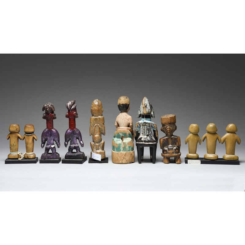 five Ewe doll, mounted as twins and triplets, a Ewe figure on a metal base, a seated figure playing a drum with painted decoration and two Senufo seated figures, the larger painted. (16)