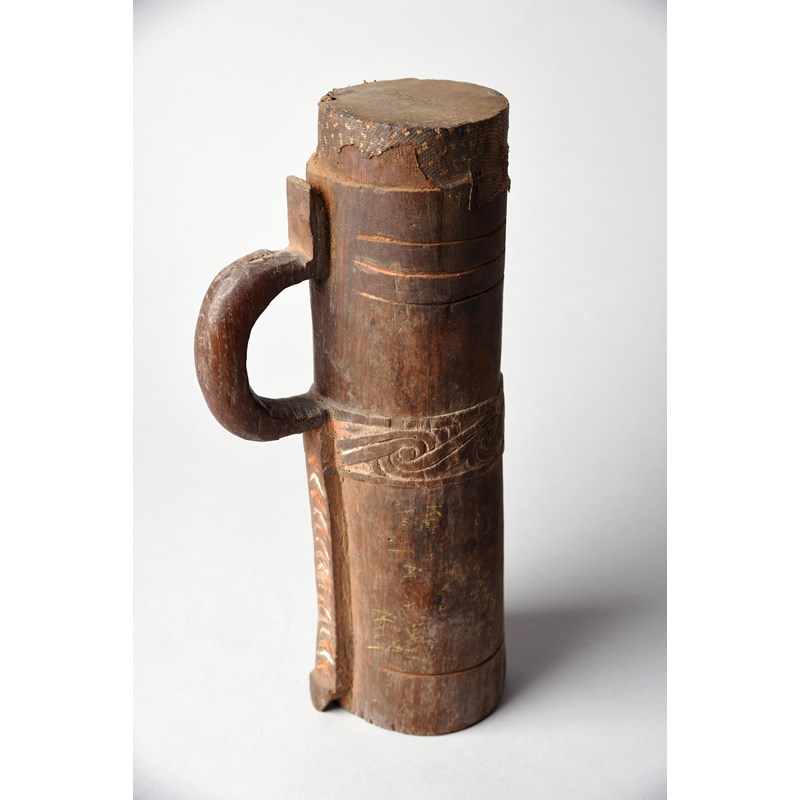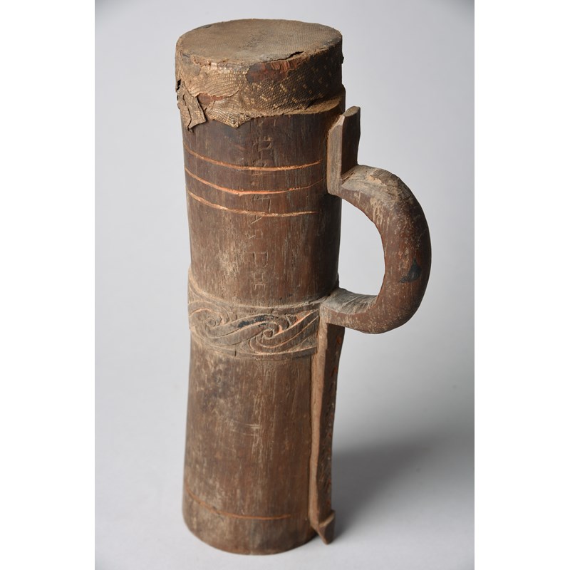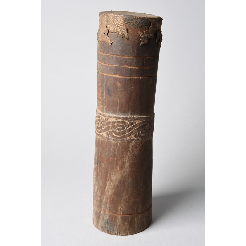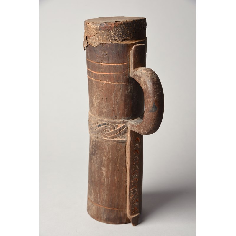 with carved decoration having remains of red/orange and white pigment, with an integral handle, and a reptile skin, the main body carved FARPCC and with a later inscriptionin yellow chalk Pres by R. Blackmore, BRIGHTON V.C., Kweto Isld, East of Milne Bay, N.G,.