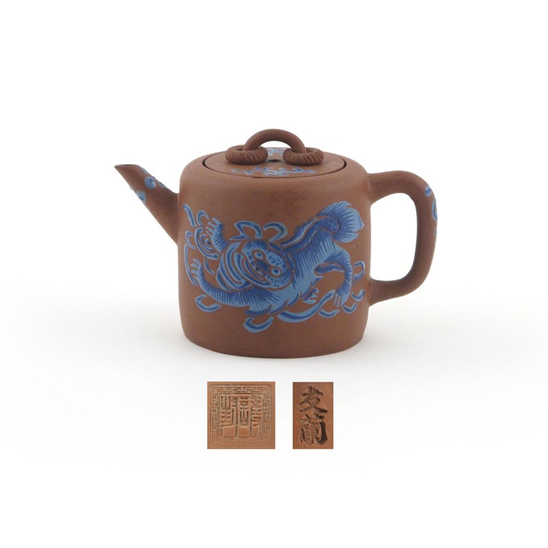 A cylindrical Yixing teapot and cover, enamelled in two shades of blue with a lion dog at play, the reverse with a flower spray, the cover fitted with two loose rings, square seal mark to the base, the cover with a two character mark, 15.5cm. (2)