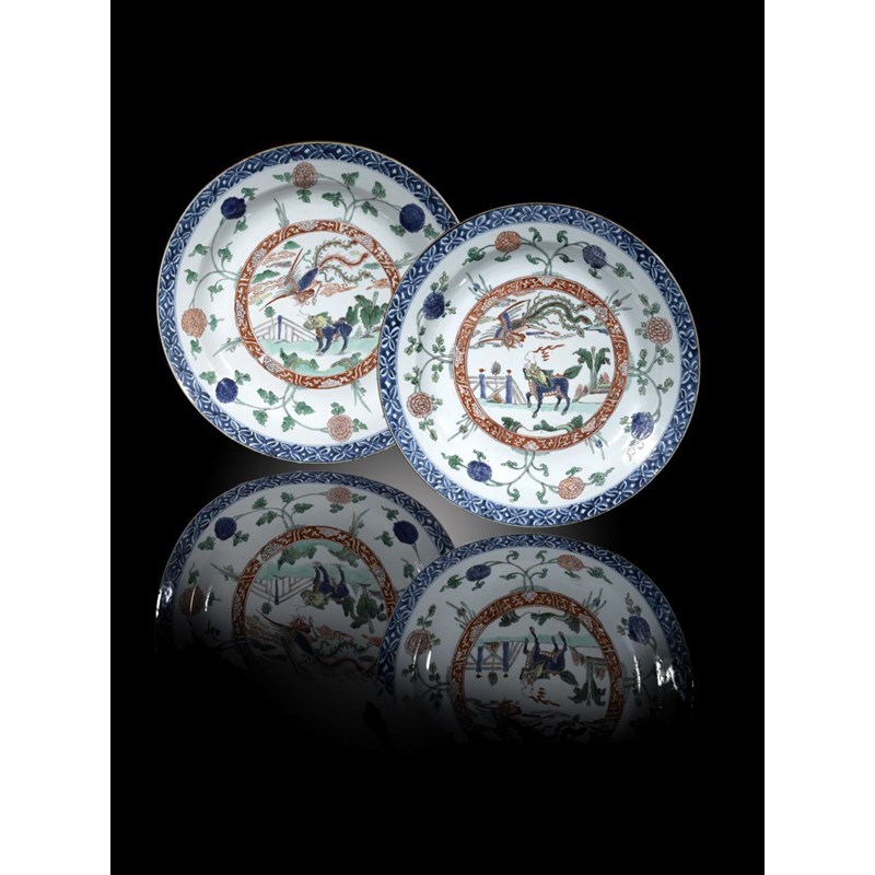 A pair of Chinese famille verte large dishes Kangxi 1662-1722, decorated with central panels of kylin and phoenix amongst rockwork and fences, encircled by borders of peony, the undersides with three flower sprays and music, stone and ribbon marks, 38cm. (2)