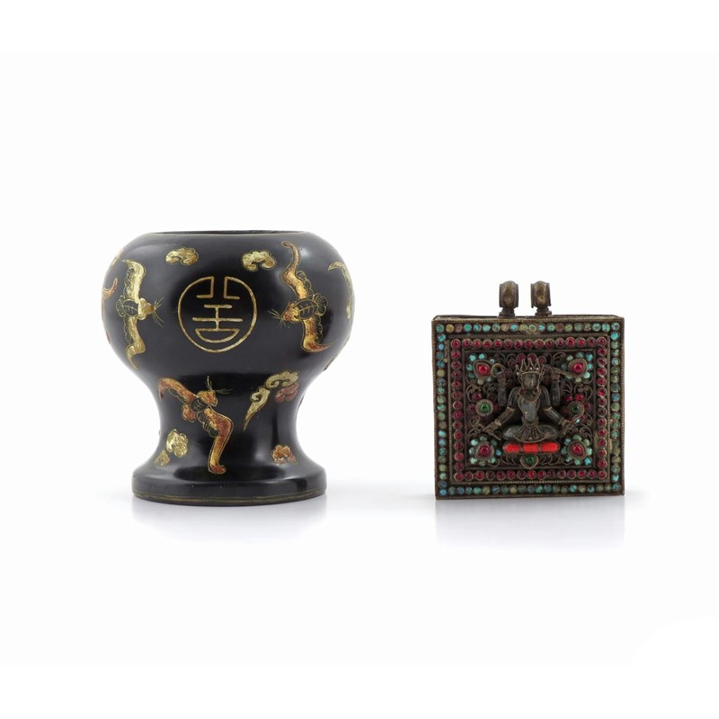 A Chinese black lacquer stem bowl 19th century, decorated in gilt with bats, shou characters and clouds, the base with a four character Kangxi mark, and a Tibetan gilt metal box, the hinged cover decorated with coloured stones, the interior containing a prayer, 11cm max. (3)