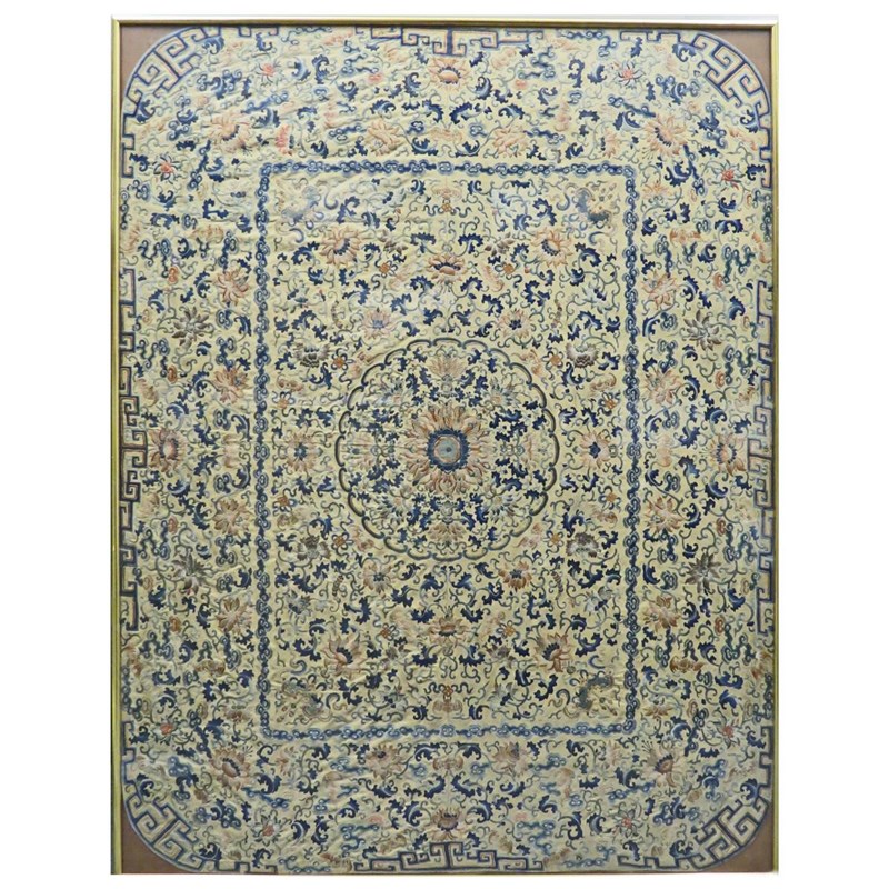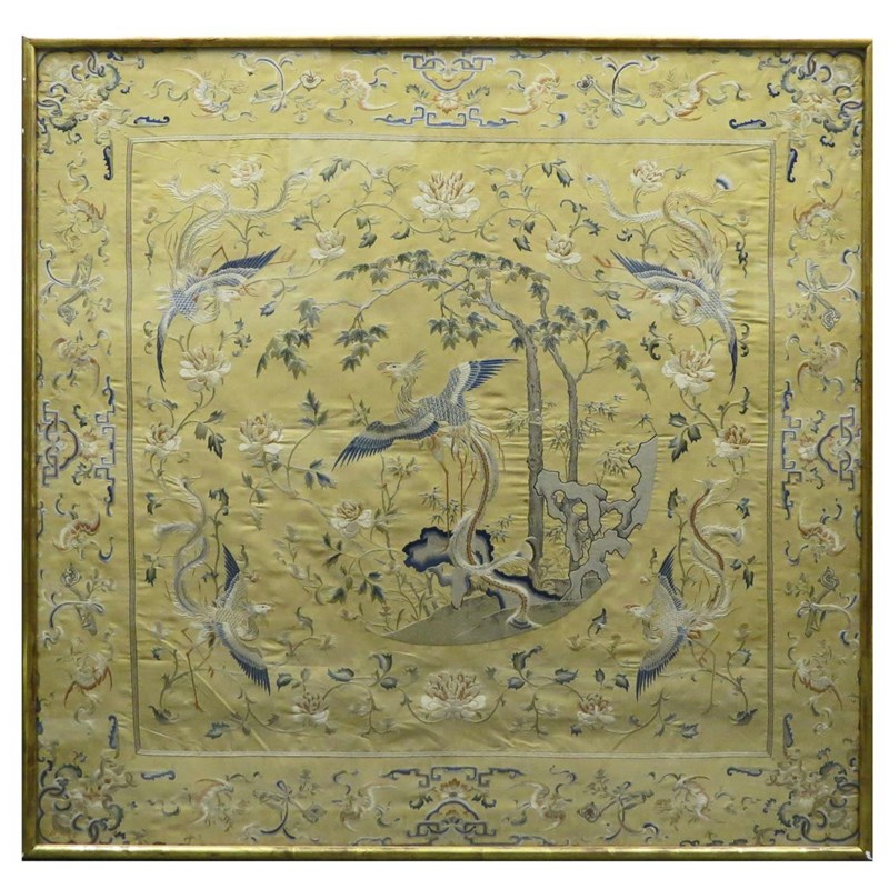 Two Chinese silk embroidered panels 19th century, one decorated with stylized flowers, leaves, bats and fungi, the other with a central roundel containing a phoenix beneath a maple tree, with borders of further phoenix, scrolling foliage, bats and ruyi sceptres, both framed and glazed, 130cm x 100cm and 102cm x 102cm respectively. (2)