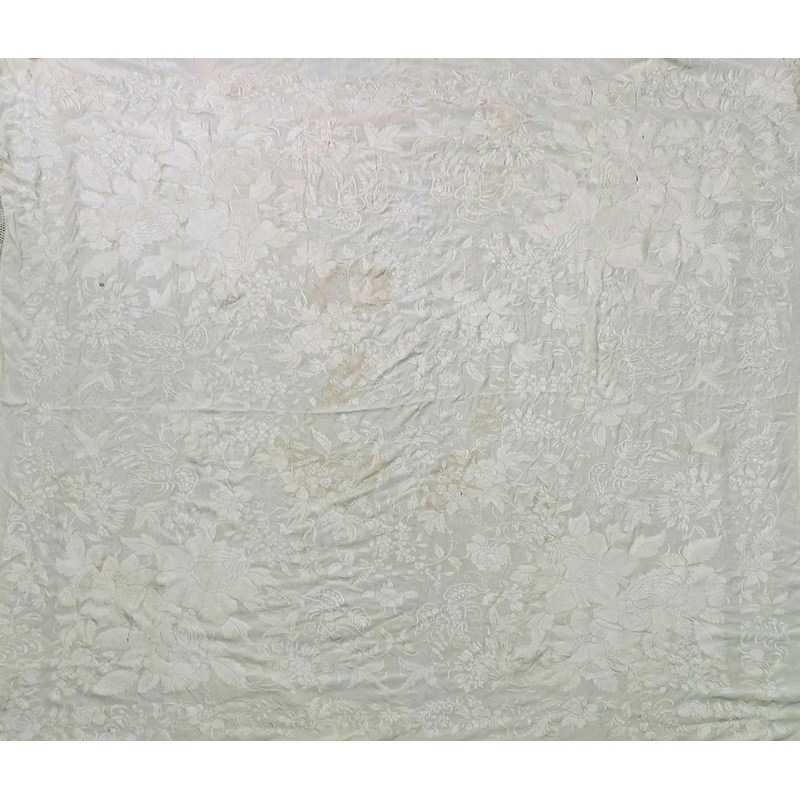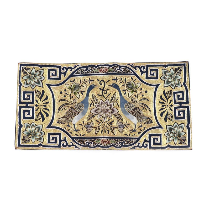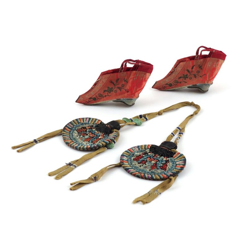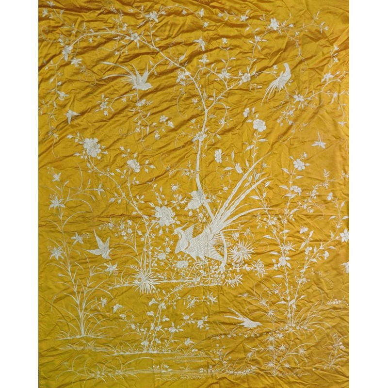 A collection of various Chinese textiles 19th and 20th centuries, comprising: a large yellow silk panel, another cream coloured with tassels, two small purses, a pair of shoes for bound feet, a rank badge mounted in a frame and various other items, 240cm max. (12)