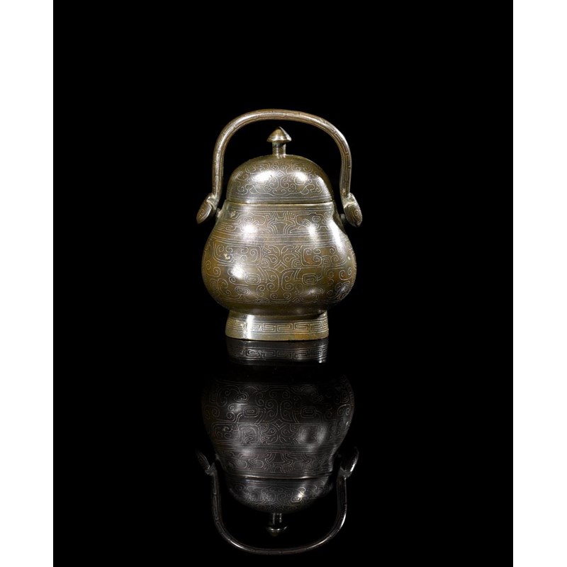 A Chinese miniature silver wire-inlaid bronze jar and cover 17th century, the ovoid body raised on a slightly flared foot, the domed lid with a pointed finial beneath a swing handle attached either sides of the rim, the body inlaid with an all-over archaistic design, including taotie, the handle and foot with key fret, 9.5cm. (2)
