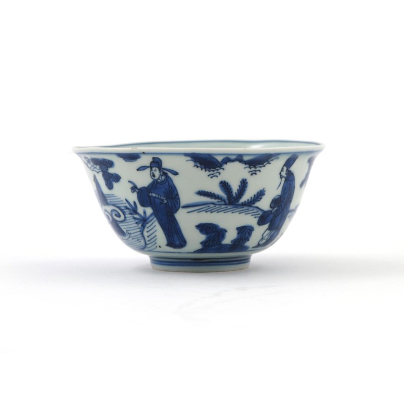 A Chinese blue and white bowl six character Jiajing mark but Wanli, painted with four figures to the exterior in a landscape with trees, rocks and scrolling clouds, the interior with a fifth figure amidst clouds, 12cm.