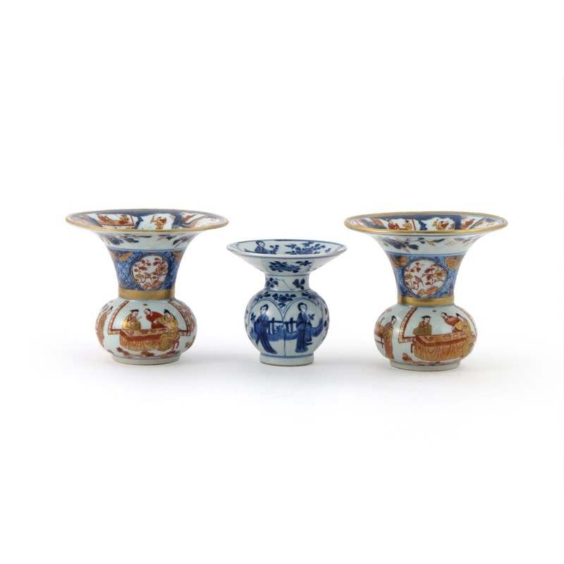 A pair of rare Chinese Imari spittoons, zhadou Kangxi 1662-1722, the globular bodies painted in underglaze red, underglaze blue and gilt depicting figures seated at a table beside a rocky fenced garden, the necks with panels containing birds, fish and crabs on a diaper ground, and a Kangxi blue and white zhadou, painted with panels containing ladies in gardens and floral sprays, 16.6cm across max. (3)