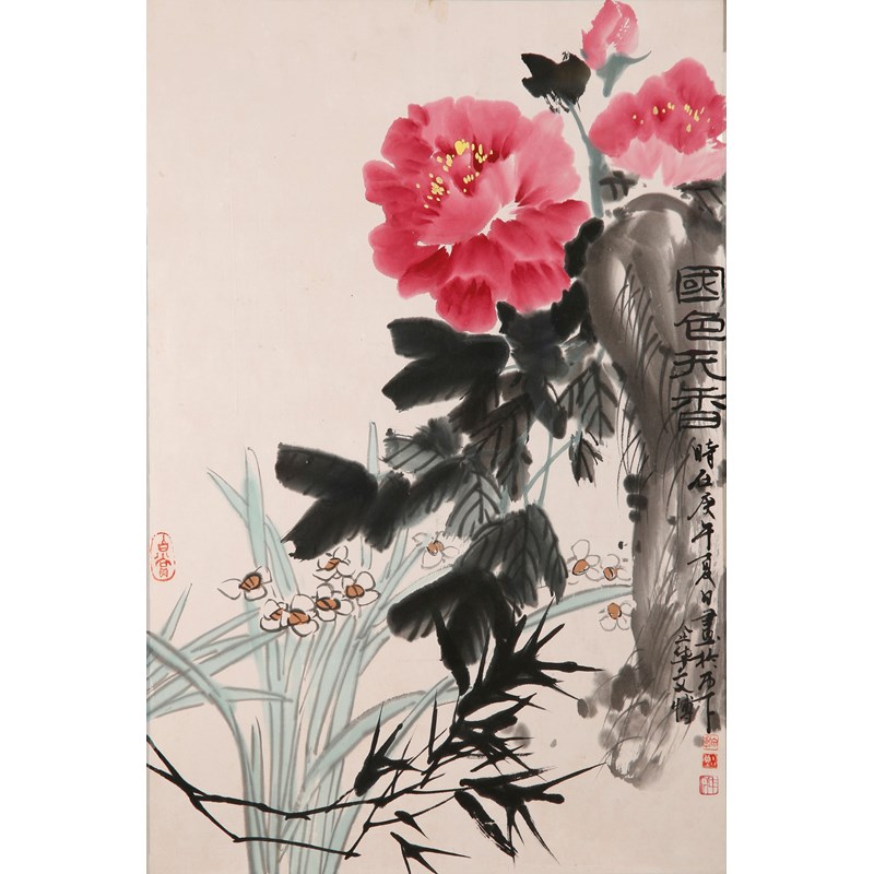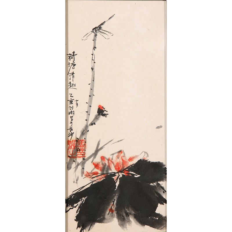 A Chinese painting, ink and colour on paper, inscribed and dated autumn of the gengwu year, together with a Japanese painting of a frog and nine other Chinese paintings variously depicting flowers, figures, animals and other subjects, each framed and glazed, 68cm x 137cm max. (11)
