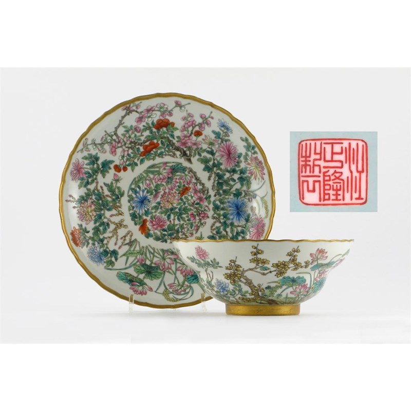 A Chinese famille rose ogee-shaped bowl and a similar lotus moulded dish, each piece delicately enamelled with an abundance of colourful flowers, foliage and fungus, the interior and bases glazed turquoise, each with a six character iron red mark Jiang Zheng Long Zhi (Made by Jiang Zheng Long), c.1820, the bowl with a 5.5cm crack, 23cm and 18cm. (2)