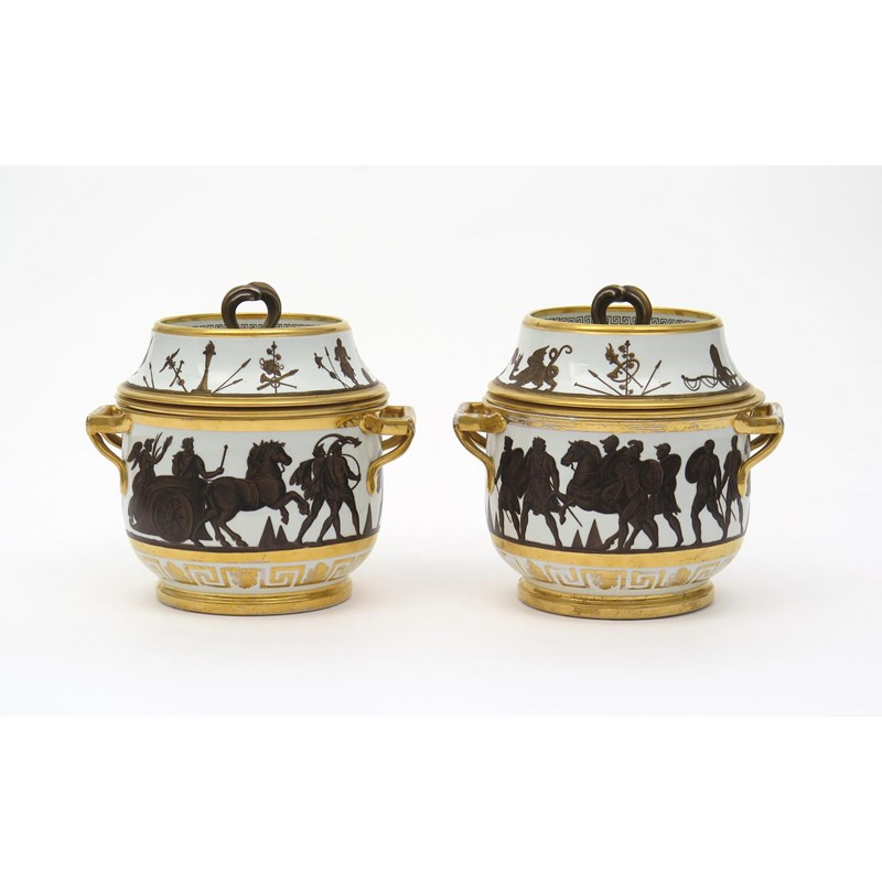A good pair of Coalport ice pails with liners and covers c.1800-05, decorated in London, each with a continuous band of Classical warriors in sepia monochrome with fine gilt detailing, the covers with mythical beasts and Classical motifs, 23.5cm. (6)