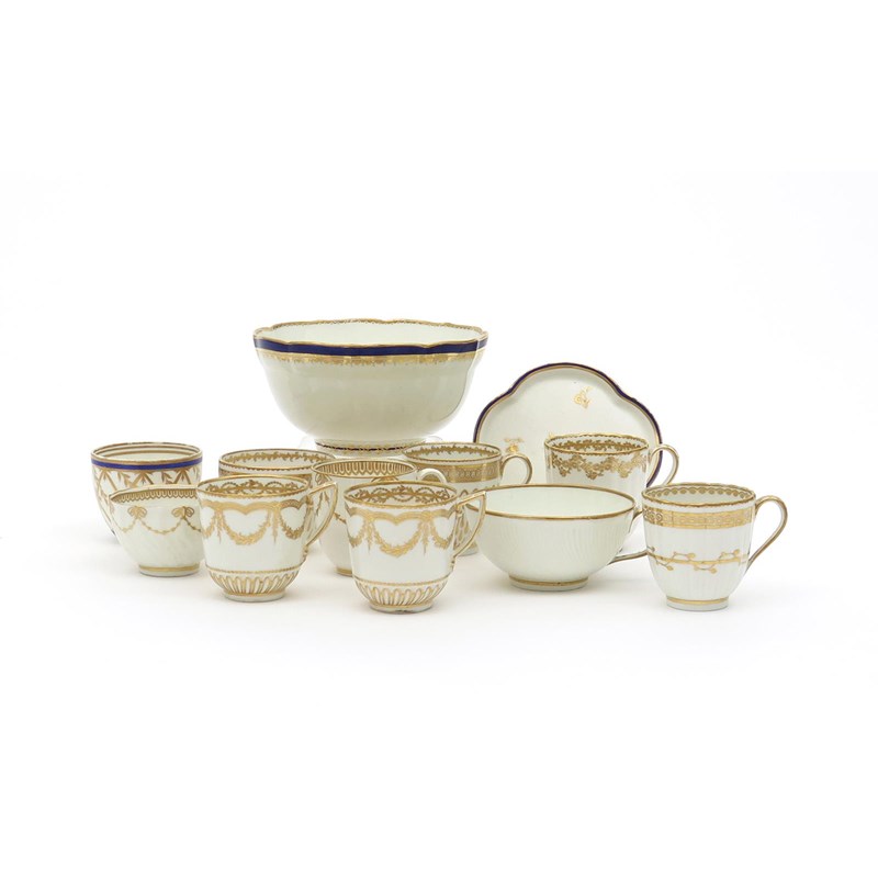 Six Derby coffee cups and three teabowls c.1790-1810, decorated in gilt with various designs of flower garlands, husk swags and interlaced ovals, a Derby spiral-moulded breakfast cup, a quatrefoil teapot stand and a large bowl, both edged in blue and gilt, 16.3cm max. (12)