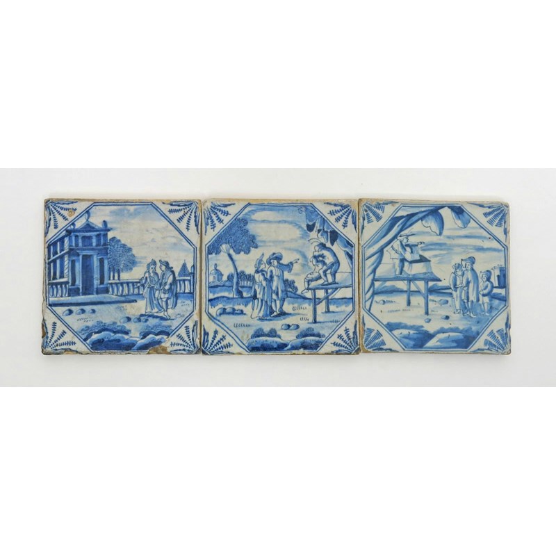 Three English delftware tiles mid 18th century, London or Liverpool, two decorated with figures standing before other figures on staging, one with a couple walking before a stately home, with rare foliate spray corners, 12.8cm. (3)