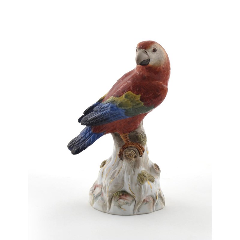 A Meissen model of a parrot 19th century, its plumage brightly coloured, perched on a rocky stump with head turned, blue crossed swords mark, incised 59, 22cm.