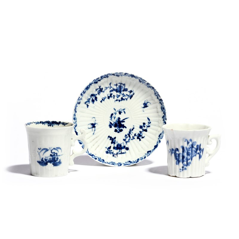 An early Worcester blue and white coffee cup c.1753, the fluted form painted with the Prunus Branch Bird pattern, a similar rare fluted saucer with floral sprays akin to the Inverted Floral pattern, and a strap-moulded coffee cup painted with the Fisherman and Willow pattern, workman's marks, 12cm max. (3)