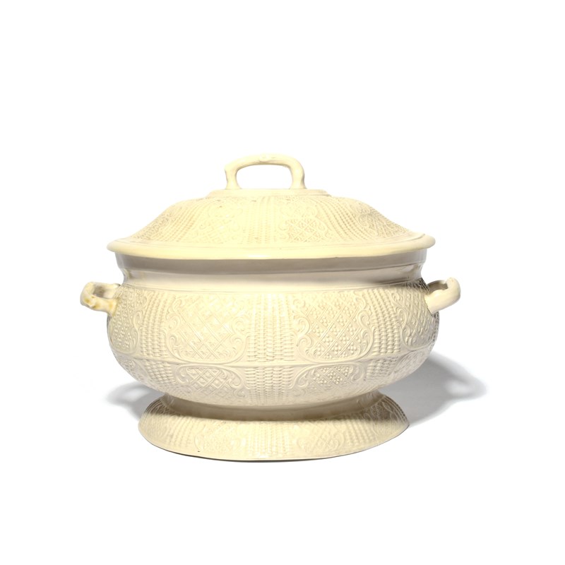 A large salt-glazed stoneware tureen and cover, c.1760-70, the oval form crisply moulded with