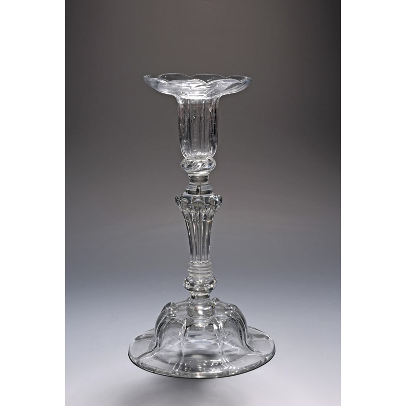 A large and rare composite stem glass candlestick, c.1740, the deep sconce with wide drip pan,