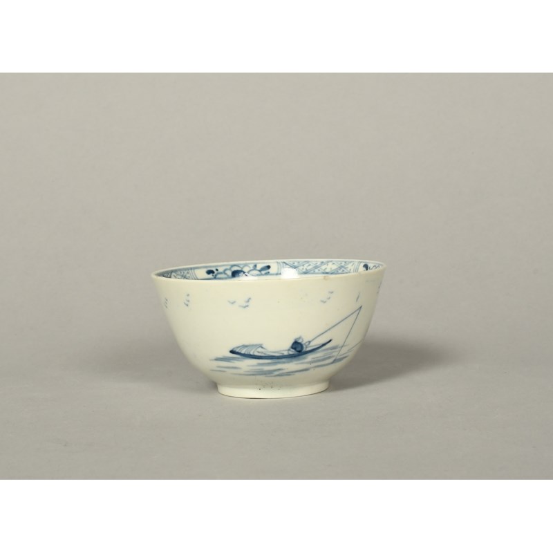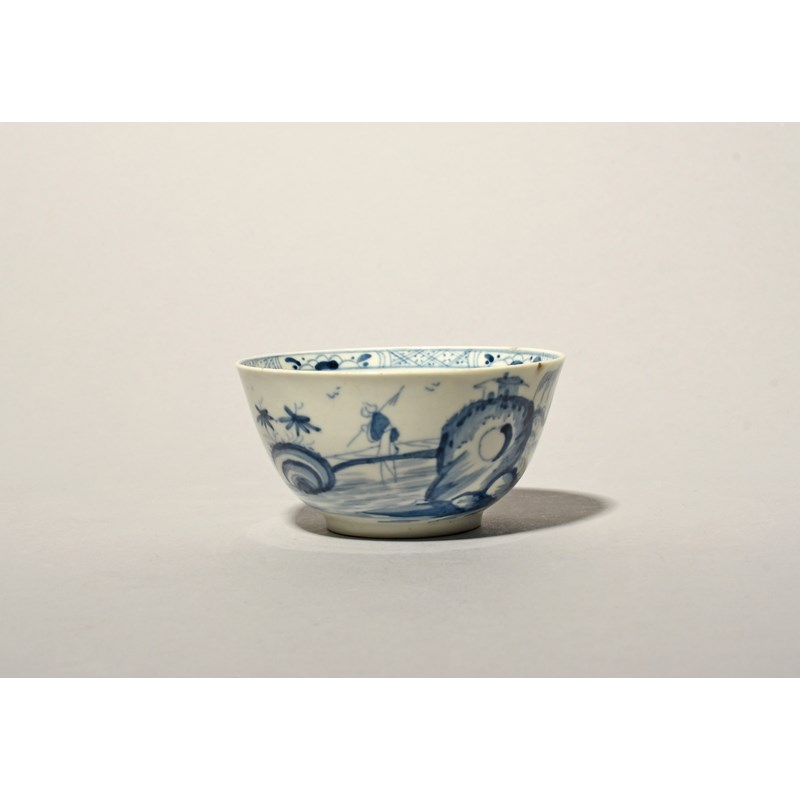 An early and rare Worcester blue and white teabowl, c.1752-54, painted in a pale blue with the High Island pattern, a figure crossing a bridge beside a tall holed rock with a small hut perched on top, workman's mark, a tiny rim chip, 8cm dia.