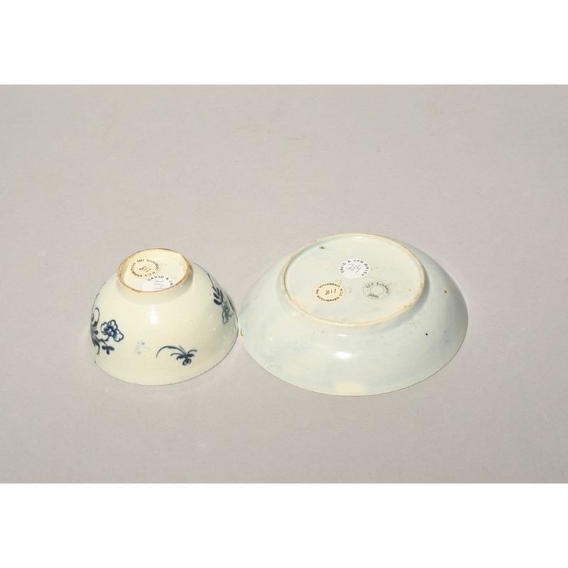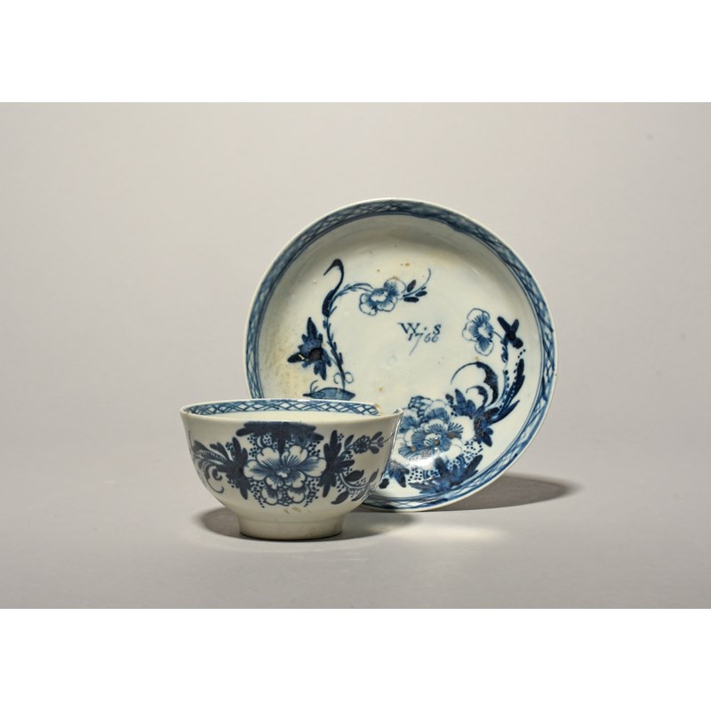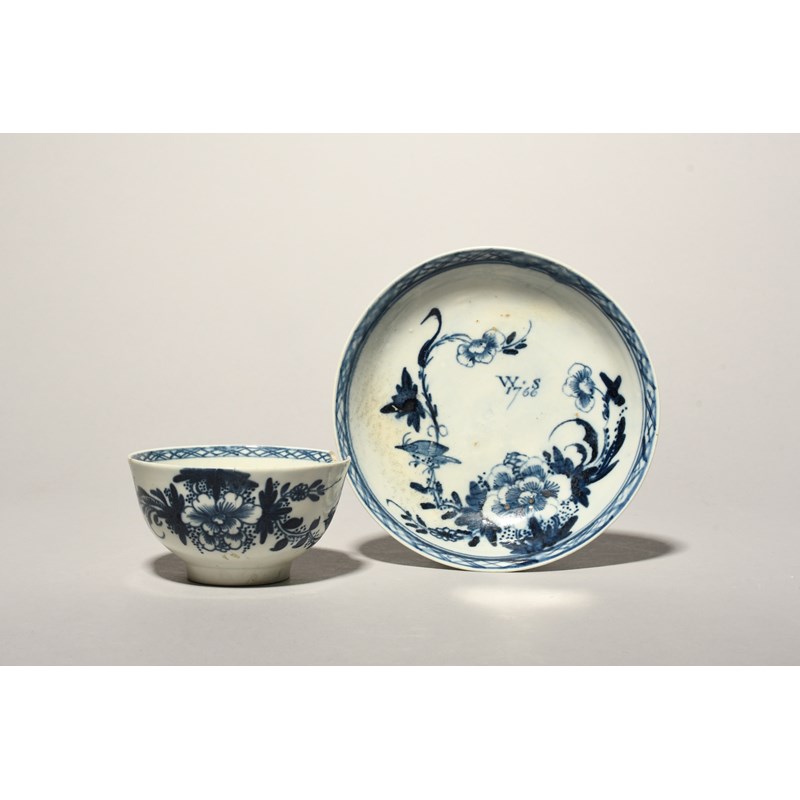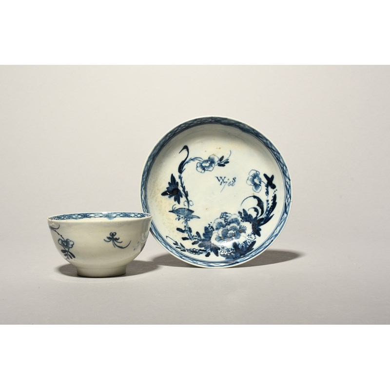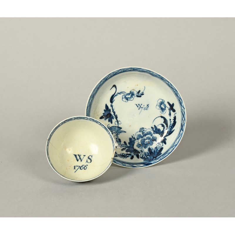 A Richard Chaffers (Liverpool) blue and white teabowl and saucer, dated 1766, painted with a small bird perched on a branch of flowering peony, inscribed 'W.S 1766' to the saucer and teabowl's interior, both cracked, a large chip to the teabowl, 13.7cm. (2)