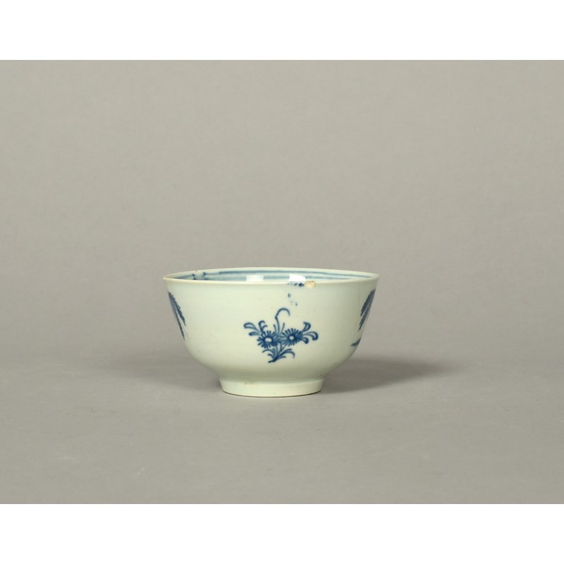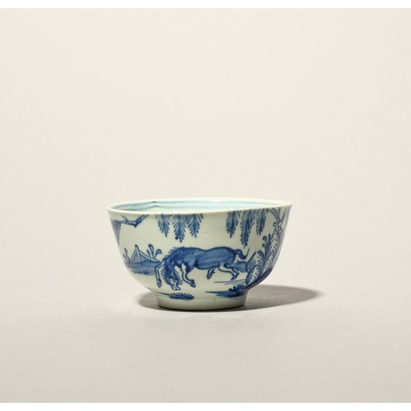 A rare Vauxhall blue and white teabowl, c.1755, painted with a horse frolicking beneath a fringed tree and beside a short fence, the reverse and interior with a single flower sprig, two short rim cracks, 7.4cm dia.