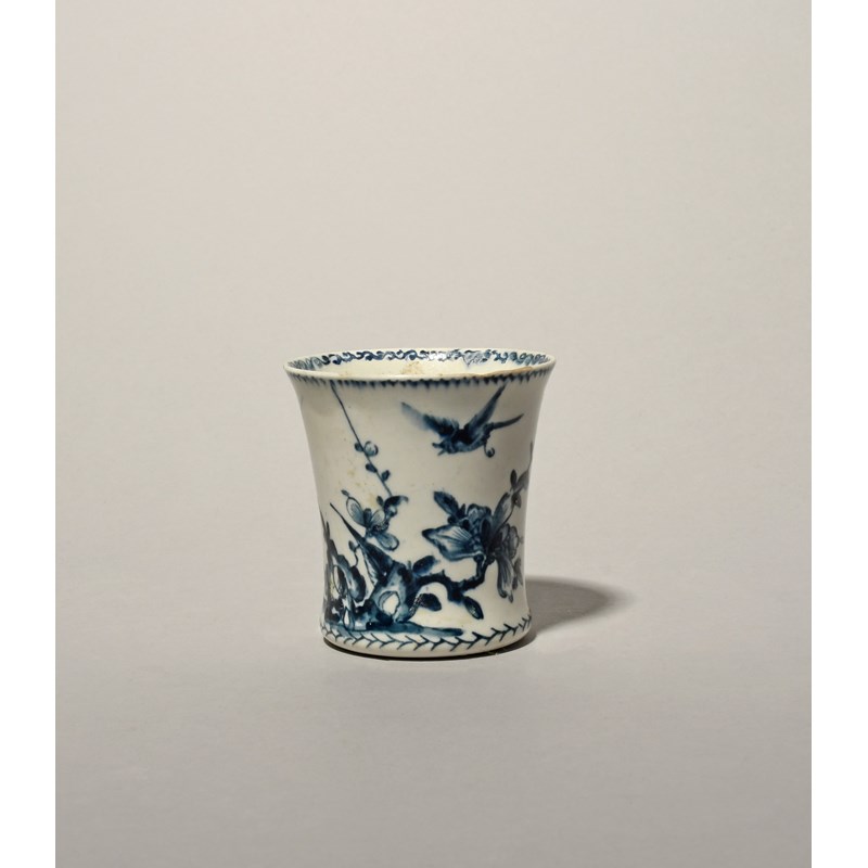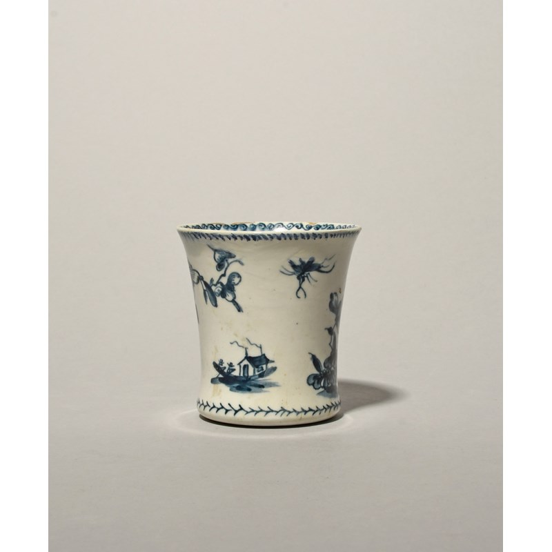 A rare Lowestoft blue and white beaker, c.1760-62, the slightly waisted form painted in a dark blue with a bird in flight above flowering Oriental branches, the reverse with a low hut with two smoking chimneys, a repair to the rim, 6.8cm high.
