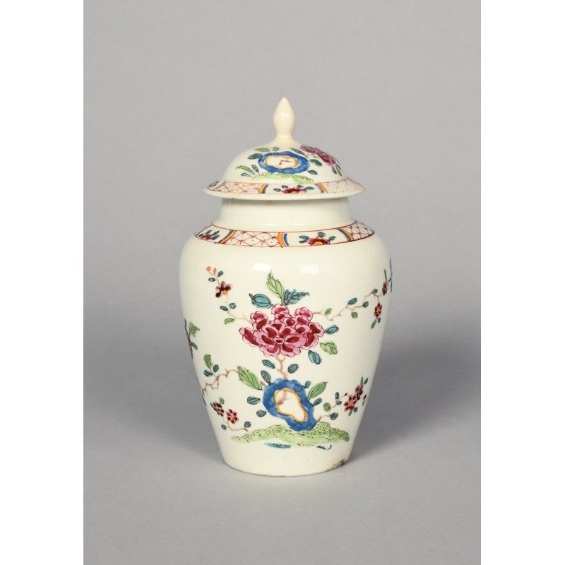 A rare and early Bow vase and cover, c.1750-52, the baluster form well painted with flowering peony branches issuing from blue holey rockwork, the shoulder and cover's rim with a border of flowerhead panels reserved on a red trellis ground edged in yellow and blue, incised R to the base, the cover broken in half and restored, 18cm. (2)