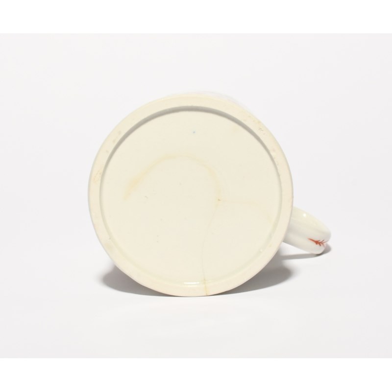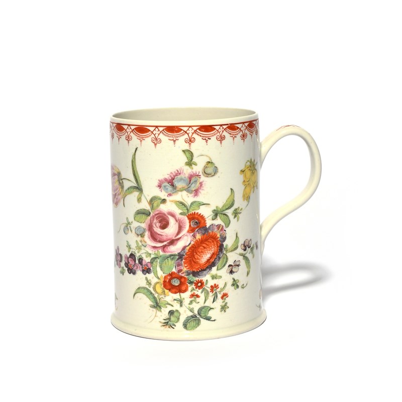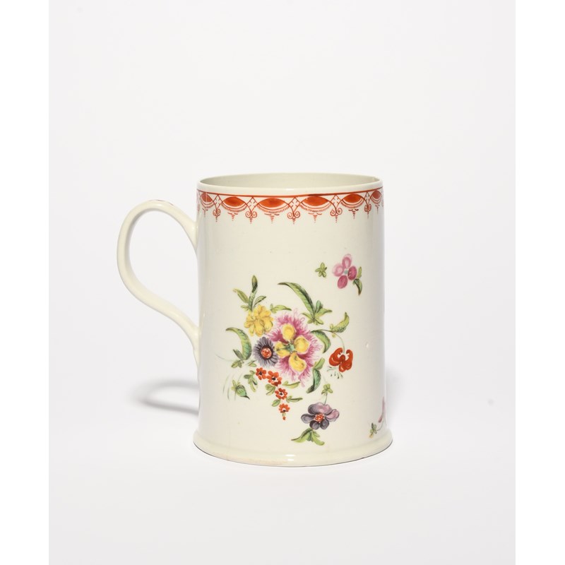 A large Bow mug, c.1765, of cylindrical form with a slightly flared foot, brightly decorated in polychrome enamels with a bold flower arrangement beneath a formal iron red scroll border, the grooved strap handle with a formal design, cracked, 14cm.