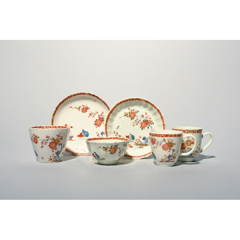 A small group of English porcelain teawares, c.1755-65, including a Bow coffee cup and saucer, a Worcester Warmstry-fluted teabowl and saucer, a Worcester flared beaker and a Liverpool coffee cup, all painted in the Kakiemon palette with the Two Quail pattern, 12.7cm max. (6)