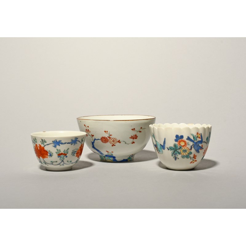 A Chelsea fluted beaker, c.1752, painted in the Kakiemon palette with birds in flight amid flowering Oriental branches, the interior with a coiled dragon, a small Japanese Kakiemon teabowl painted with stylized peony scrolls, and a hard-paste porcelain small bowl painted with flowering branches, a small chip to the Chelsea, a repair to the Japanese teabowl, 10.7cm max. (3)
