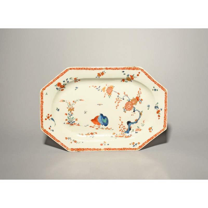 A large Bow octagonal meat dish or charger, c.1755, painted in the Kakiemon palette with the Two Quail pattern, the birds beneath flying insects and flowering branches, within a red and gilt flowerhead border, 43.2cm.