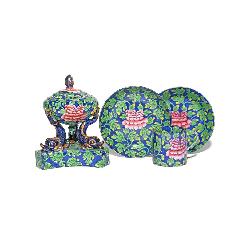A Spode pearlware pot pourri vase and cover c.1820, with a coffee can and two saucers, all richly decorated in the 'Peony 2' pattern with flowering peony branches detailed in pink, green and yellow enamel on a blue ground, the pot pourri vase raised on three dolphin supports above a shaped base, some faults, 17.2cm max. (5)