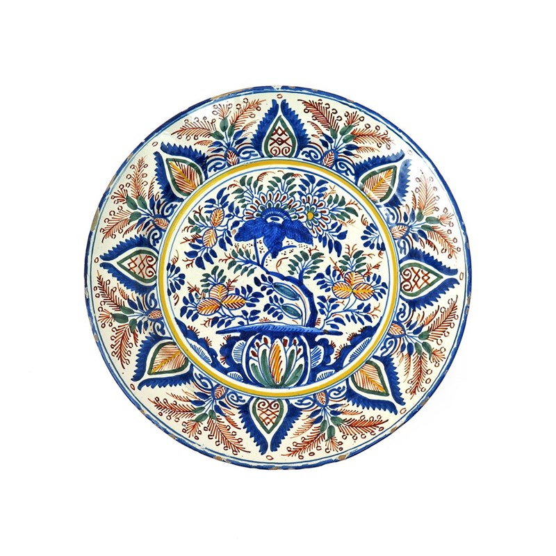 A large delftware polychrome charger probably London c.1705, brightly decorated in a polychrome palette of red, yellow, blue and green, with flowering Oriental branches within a border of stiff leaves alternating with feathery foliate sprigs, some glaze chipping, 34.3cm.