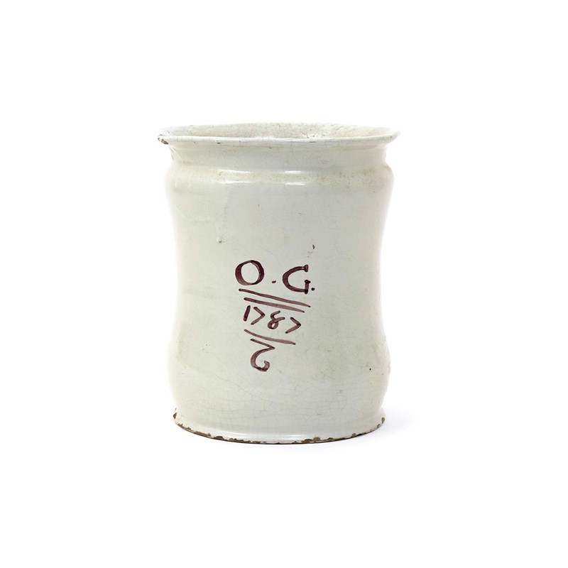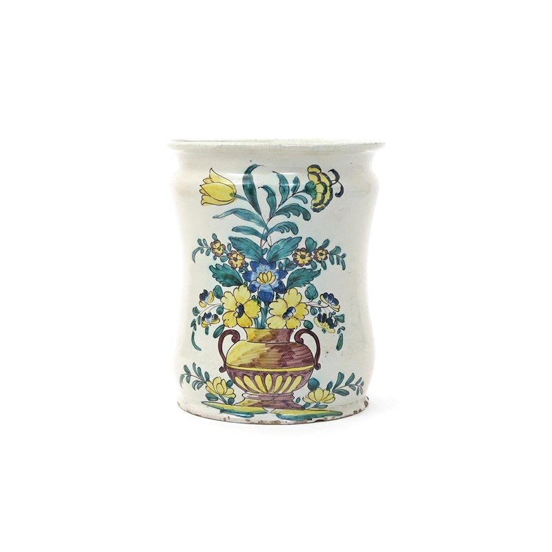 A large Italian maiolica albarello dated 1787, possibly Liguria, one side painted with a two-handled vase issuing tall flower stems including tulip and chrysanthemum, the reverse inscribed 'OG 1787' in manganese, some faults, 23cm.