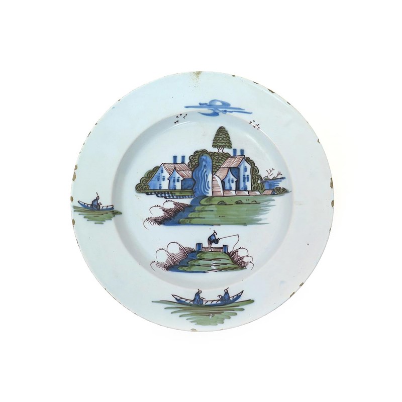 A large Bristol delftware charger c.1760-70, brightly enamelled in blue, red, manganese and green with a typical landscape, a Chinese figure fishing from a bridge and three further figures in boats to the rim, minor rim chipping, 34.2cm.