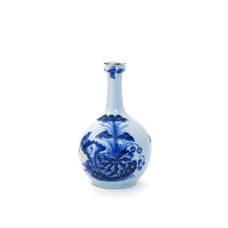 A Liverpool delftware guglet mid 18th century, the rounded body painted to two sides with a bird perched on rockwork beside bamboo and peony, the tapering neck rising to a swollen knop beneath the flared rim, painted with small leaf sprigs, a small amount of chipping to the rim, 23cm.