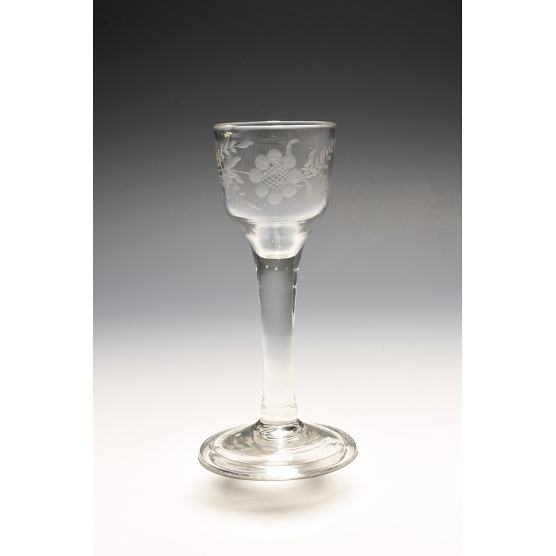 A small wine glass of Jacobite significance, c.1750, the ogee bowl engraved with a sunflower spray