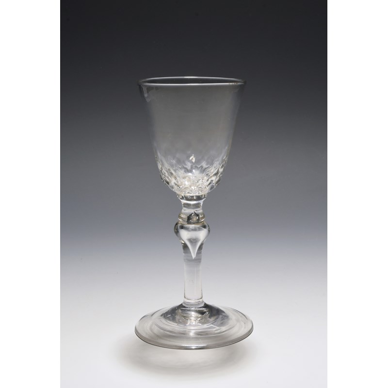 A balustroid wine glass, c.1730-40, the generous round funnel bowl with honeycomb moulding to the