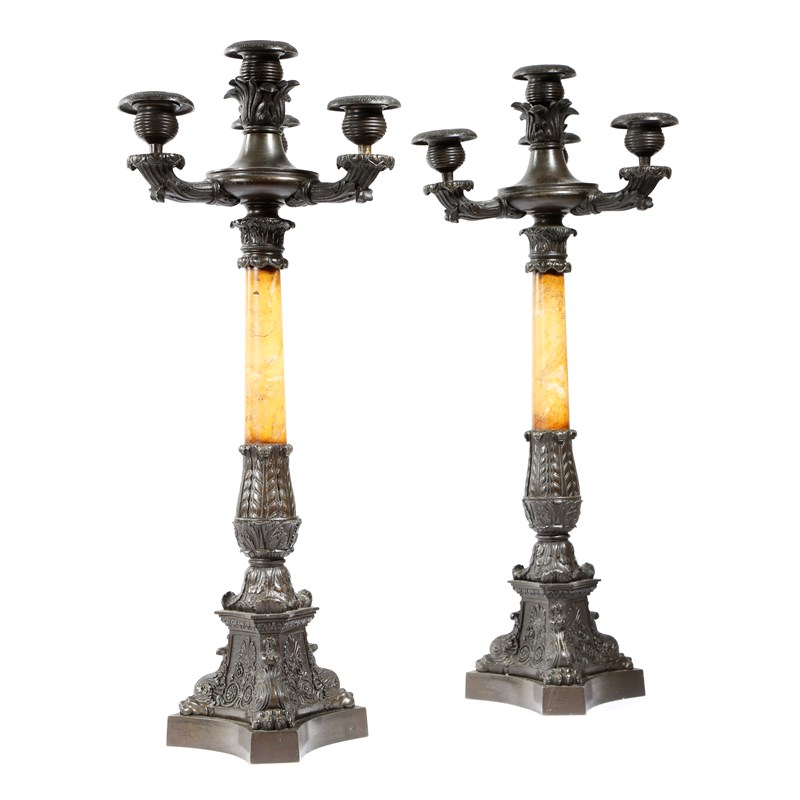 A pair of Louis Philippe patinated bronze and Siena marble candelabra