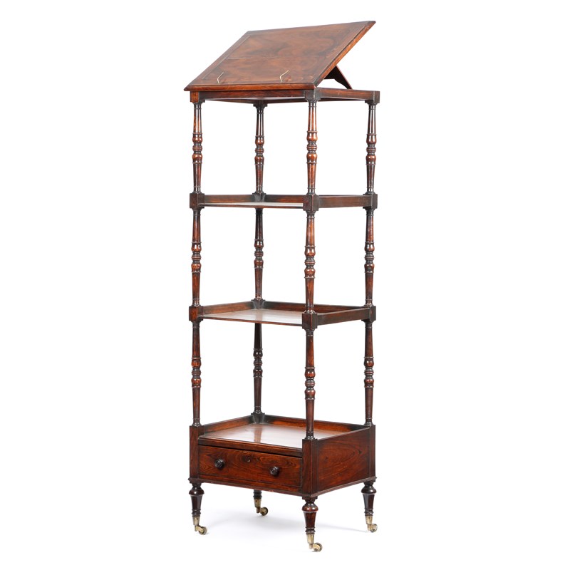 A George IV simulated rosewood four-tier whatnot, the top with a hinged reading / music rest on a ratchet, with turned supports, with a base drawer and on brass caps and castors, 138cm high, 48.2cm wide, 37.4cm deep.
