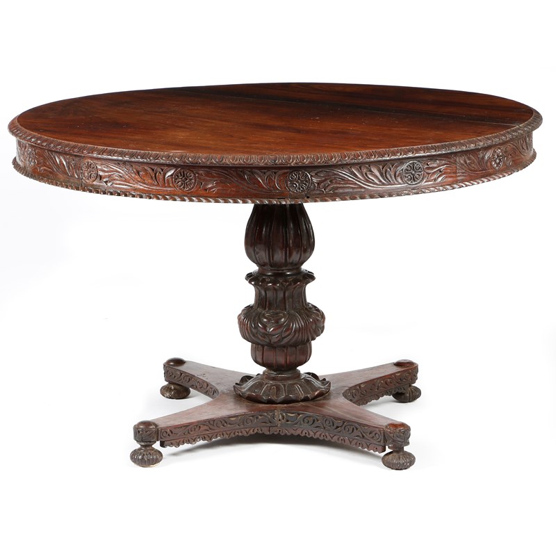 λ A 19th century Anglo-Indian rosewood centre table, the circular top with an egg and dart moulded edge and a leaf and rosette frieze, on a bulbous leaf carved stem and quatreform base, 76.3cm high, 121cm diameter.