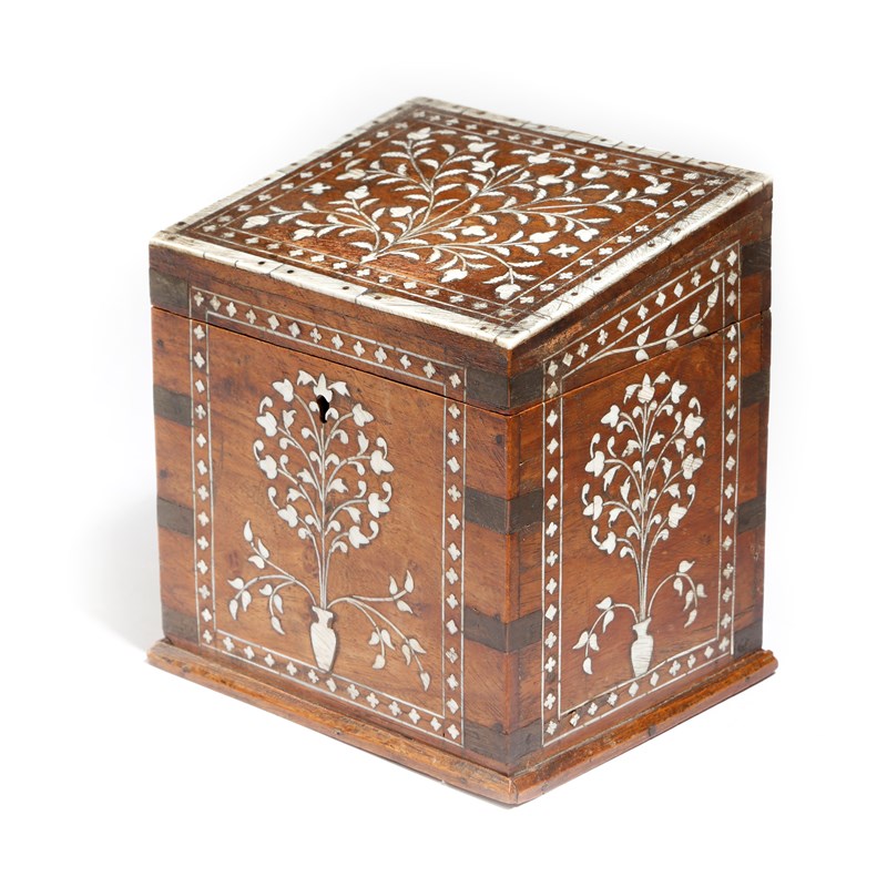 λ An Anglo-Indian hardwood tea caddy, inlaid with bone and ivory with urns of flowers and leaves, with brass mounts, the sloping lid revealing a single lidded interior, Hoshiarpur, late 19th / early 20th century, 15.7cm high, 15cm wide, 12.4cm deep.