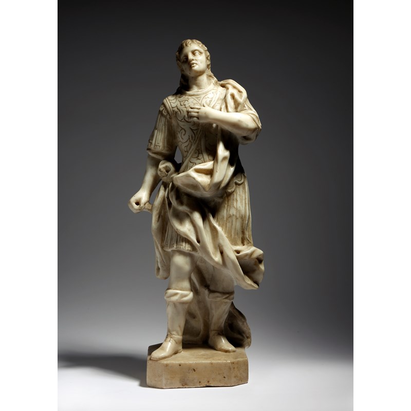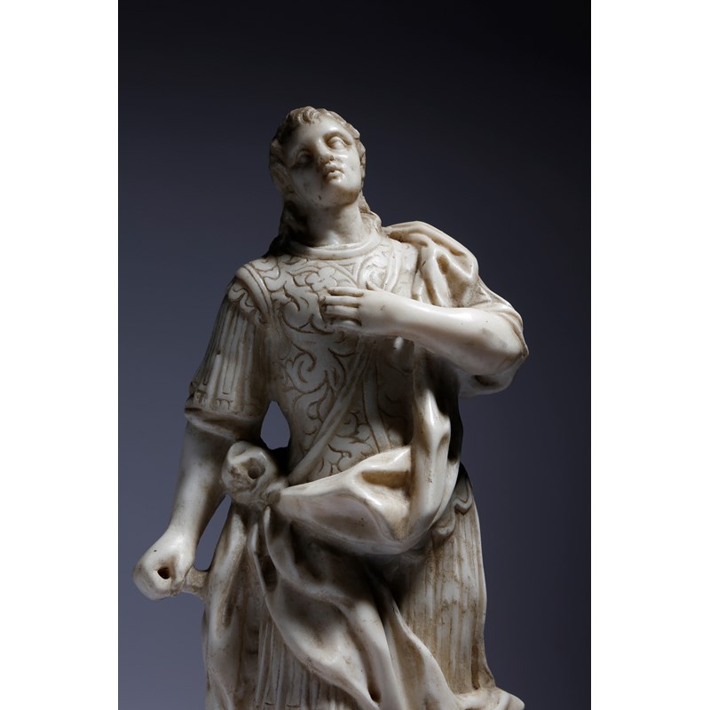 An 18th century marble figure of a man, thought to be St. Sebastian, wearing a billowing cloak over foliate engraved armour, on a plinth base, with an inventory number '1641', 46.8cm high.