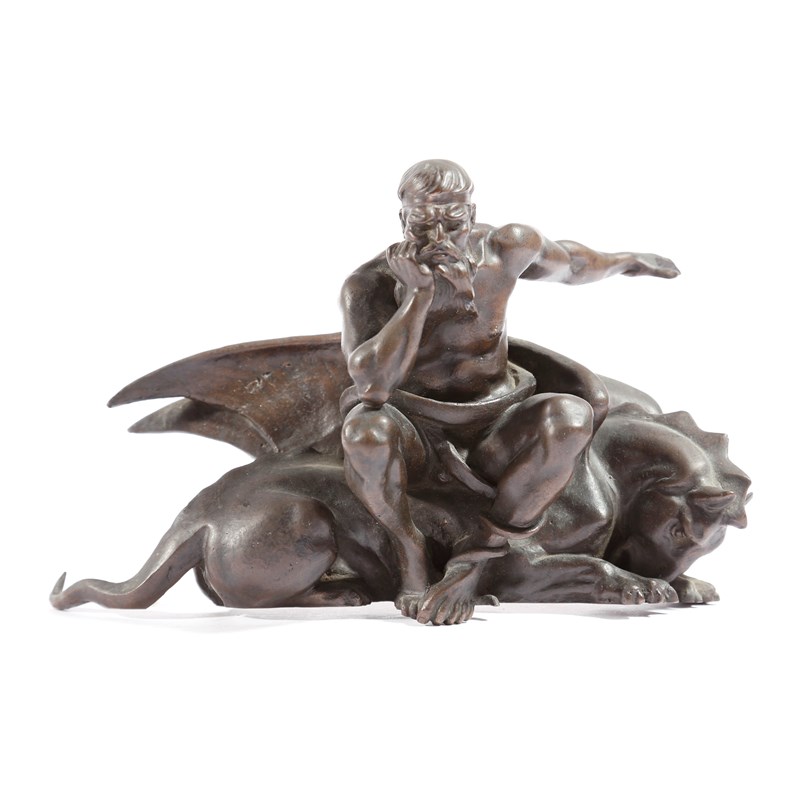 An Arts & Crafts bronze group of Pegasus and Bellerophon, with the Greek hero seated on Pegasus' back, weary after having defeated the Chimera which is entwined round his body, previously mounted, late 19th / early 20th century, 16.3cm high, 27cm wide.