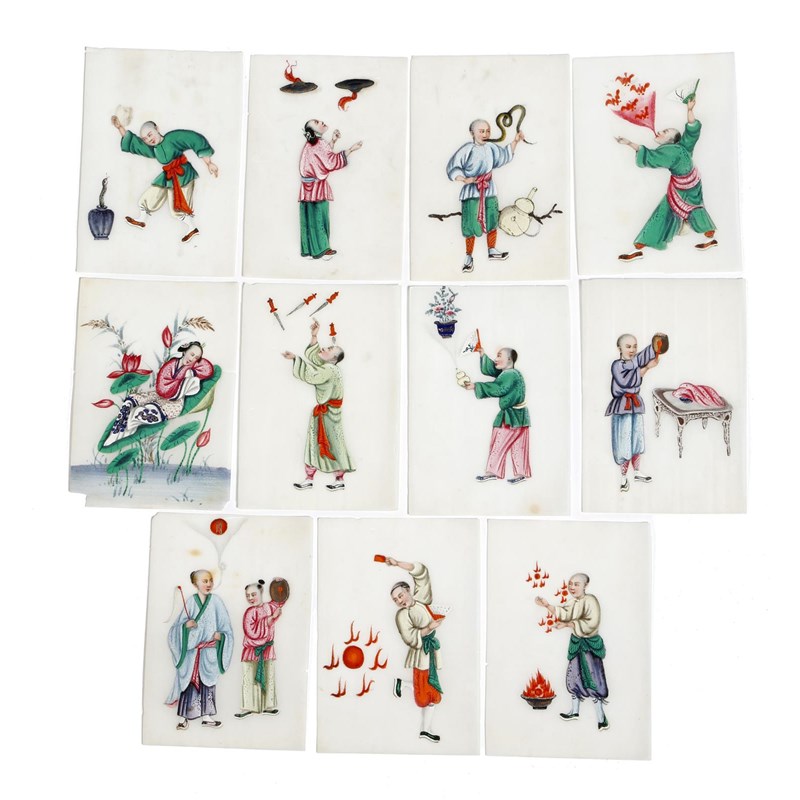Eleven Chinese rice paper and gouache paintings, the majority depicting street performers, including: a fire juggler, a snake eater, a sword thrower and a magician, late 19th / early 20th century, 11 x 7.5cm, in a glazed box. (12)