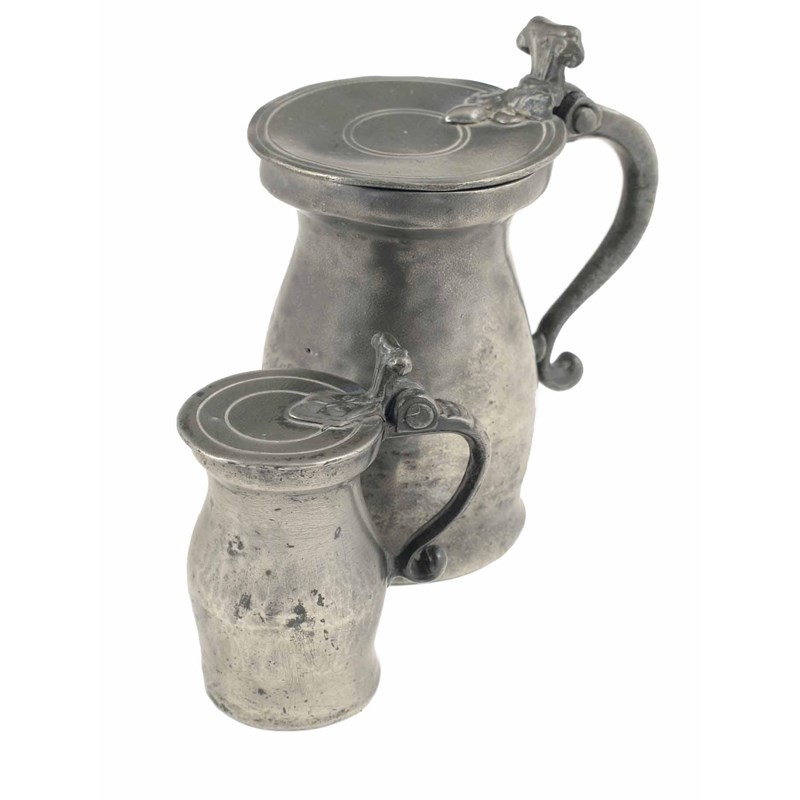 An 18th century pewter double volute baluster measure, pint, body indistinctly inscribed, unmarked, 6in (15cm) h and a similar baluster measure, gill, unmarked, 4in (10cm) h. (2)